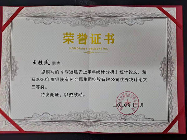 12月29日,在集團公司統(tǒng)計工作會議上,公司獲“2020年度統(tǒng)計工作先進單位”榮譽稱號,公司《銅冠建安上半年統(tǒng)計分析》論文榮獲集團公司優(yōu)秀統(tǒng)計論文三等獎。